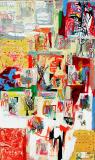 oil, enamel, paper, oil pastel, acrylic, Belgium currency, collage on stretech silkscreen