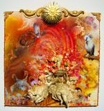 Spraypaint, glitter, wood, appliques, plaster, collage, paper and oil paint on panel