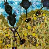 resin, pigment, oil, heads made of clay attached to canvas